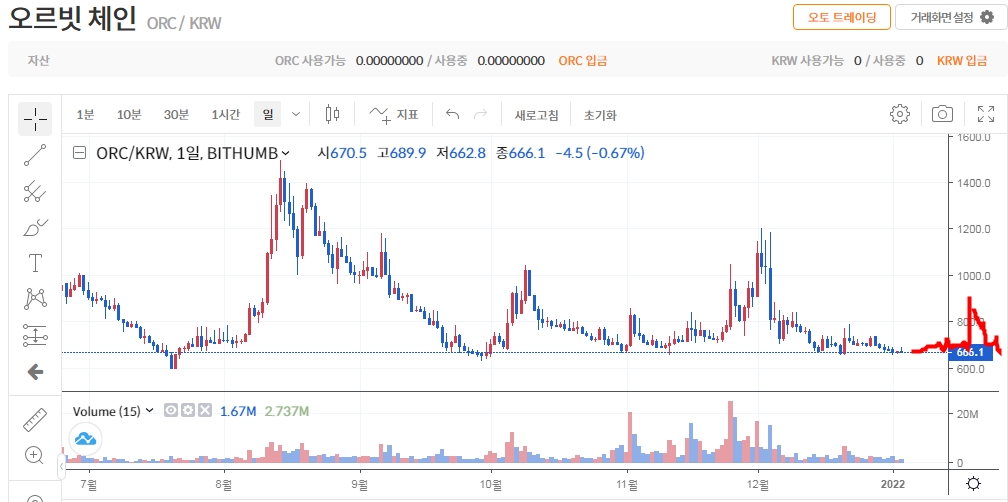 시가총액 약 4,000억 밑으로 형성되어 있는 오르빗체인 코인