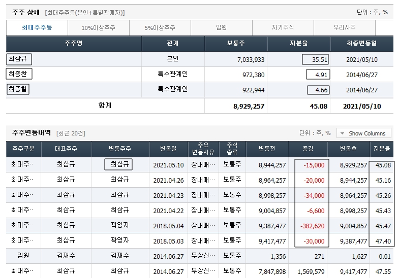 현재 회사 상황이 안좋다는것을 표현해주는게 최삼규씨가 살짝 살짝 지분을 매도하고 있음.