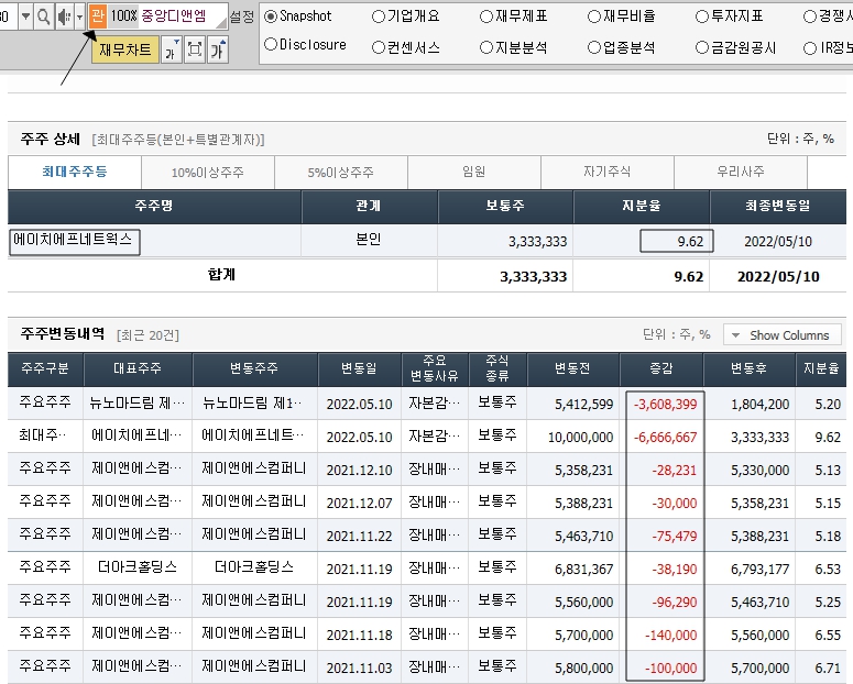 역시 여기도 주주변동내역을 보시면 에이치에프네트웍스, 뉴노마드림이 계속 장내매도를 하다가 최근에는 자본감소까지 한 상황임