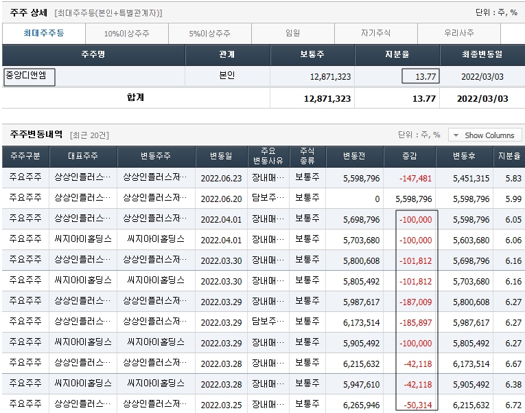 주주변동내역을 보시면 상상인저축은행과 씨지아이홀딩스가 지속적으로 장내매도를 하고 있음