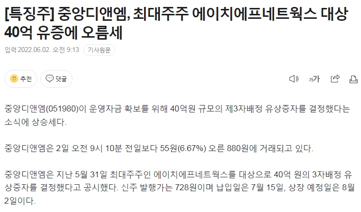 최근 중앙디앤엠을 3자배정으로 유상증자를 하고... 특히 운영자금을 확보하기 위해 증자를 했다는게 보임
