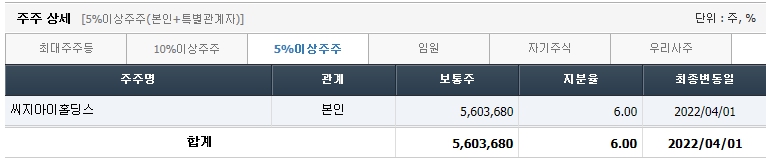 그 뒤로 씨지아이홀딩스가 2대주주로 있고 지분은 6퍼센트 보유를 하고 있음