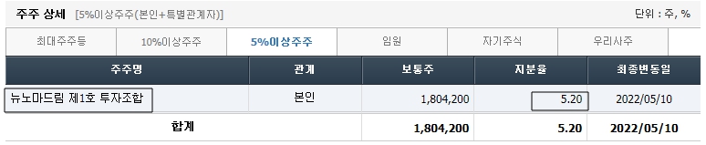 2대주주로 뉴노마드림 제1호 투자조합이고 지분율은 약 5퍼센트를 보유 중
