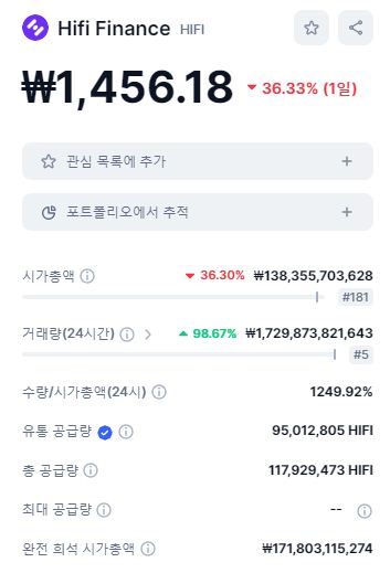 The live Hifi Finance price today is ₩1,427.65 KRW with a 24-hour trading volume of ₩1,750,946,423,282.38 KRW. We update our HIFI to KRW price in real-time.
