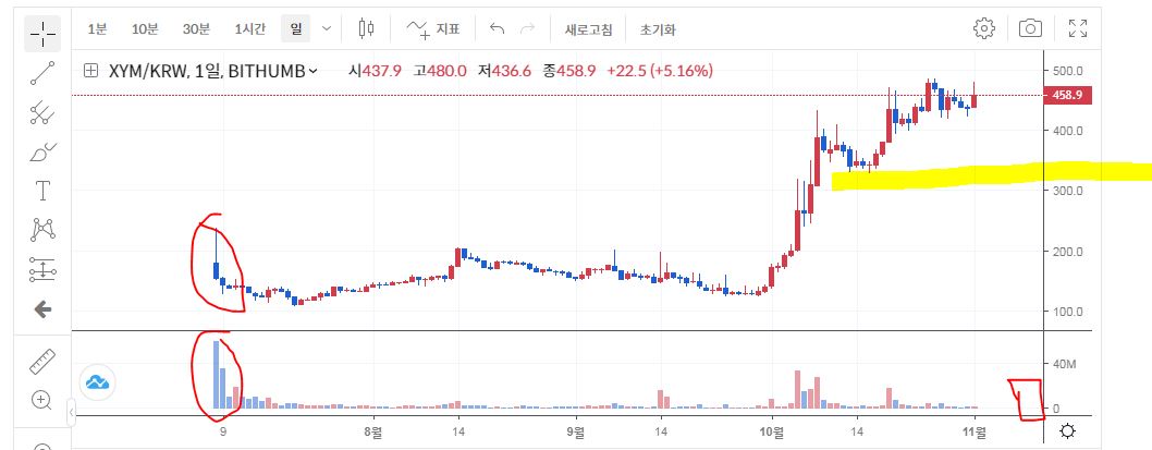 현재 450원대에서는 많은 거래량이 발생이 될 경우