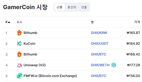 5곳의 거래소가 상장이 되어있는것을 확인 할 수 있다.