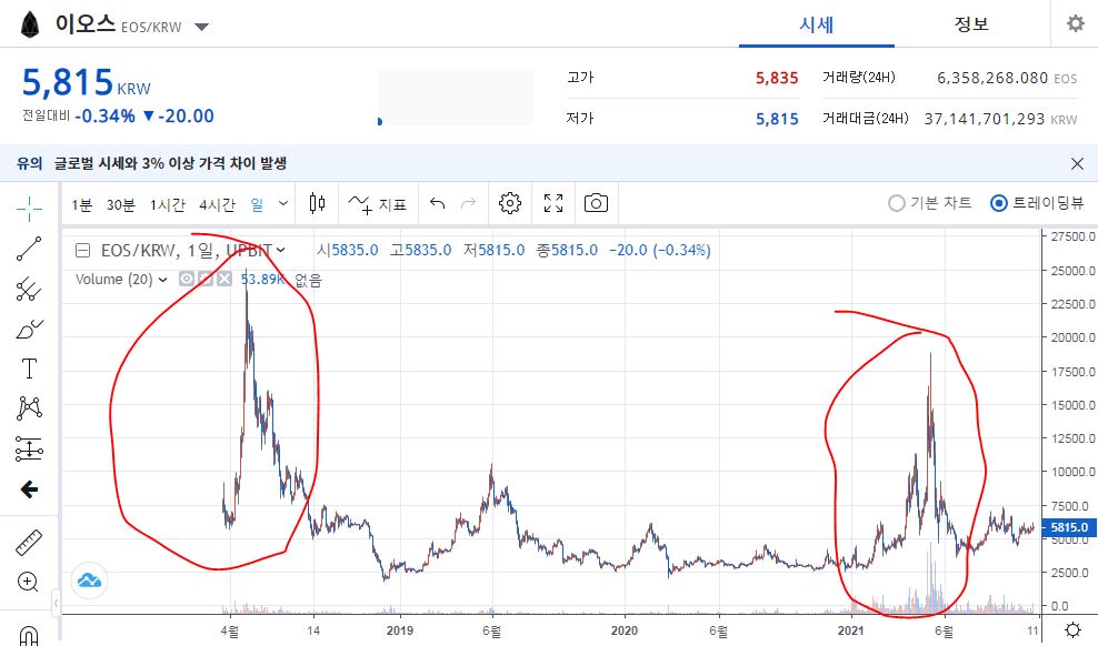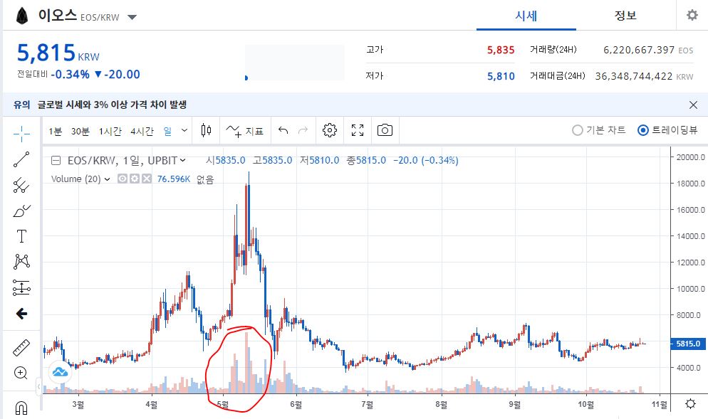 동그라미 그은곳이 최대 거래량이 발생한 곳이다.